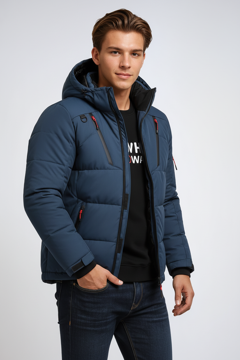 Ta męska kurtka zimowa pikowana łączy funkcjonalność z miejskim stylem. Ciepła podszewka zapewnia komfort cieplny, a kaptur z regulacją chroni przed chłodem i wiatrem. Pikowany materiał i praktyczne kieszenie nadają jej współczesny, sportowy charakter. Idealna do codziennego użytku.