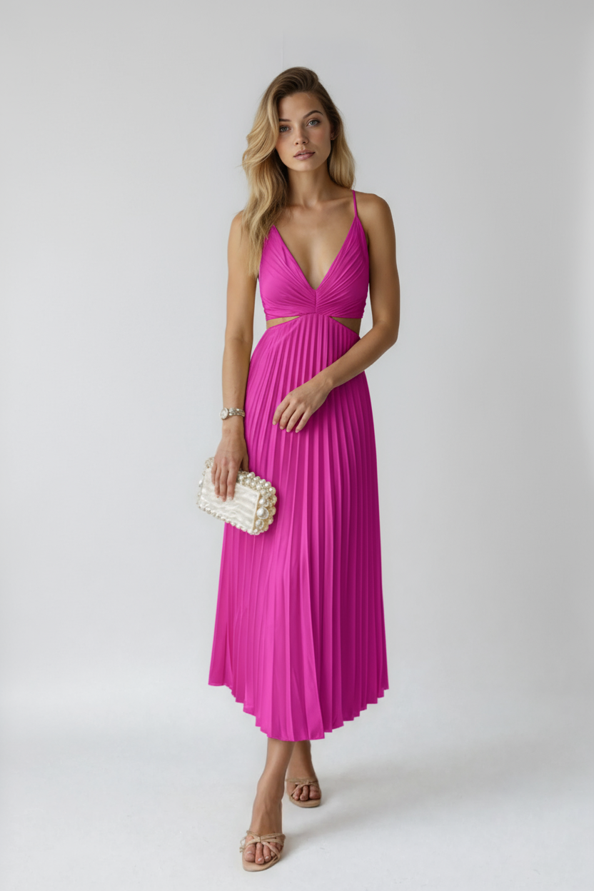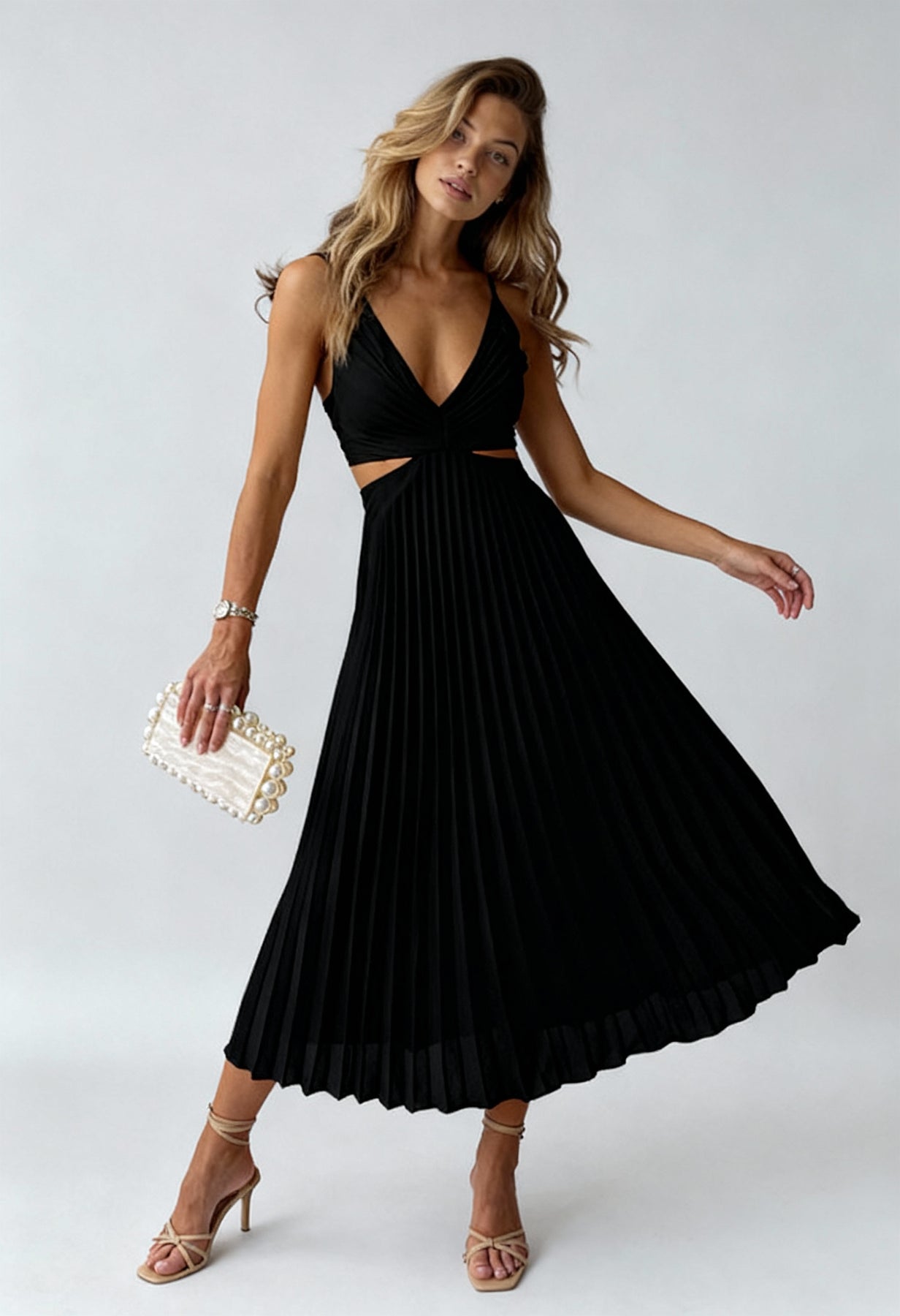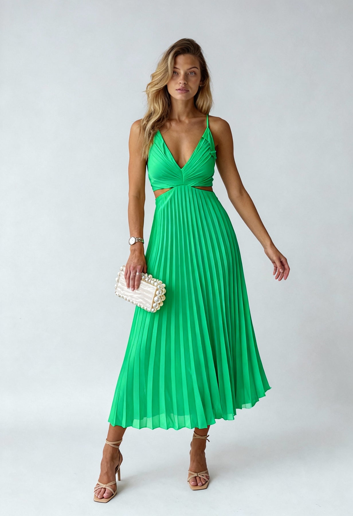 Ta sukienka midi zachwyca plisowanym dołem i dekoltem w kształcie litery V, który podkreśla sylwetkę. Wycięcie w talii dodaje nowoczesnego akcentu, tworząc harmonijny balans między elegancją a świeżością. Idealna na przyjęcia, kolacje lub wyjątkowe okazje, kiedy liczy się styl i pewność siebie.