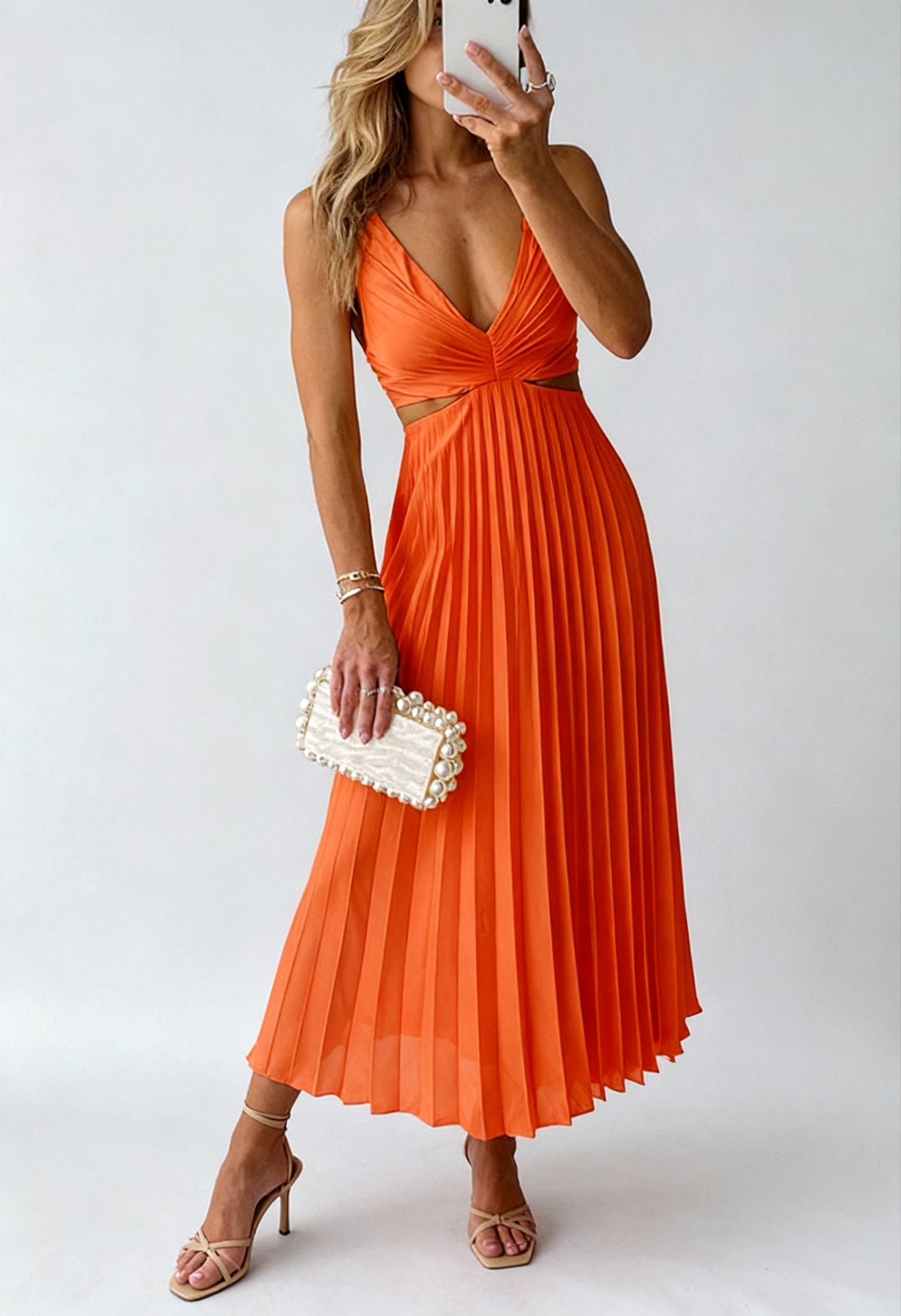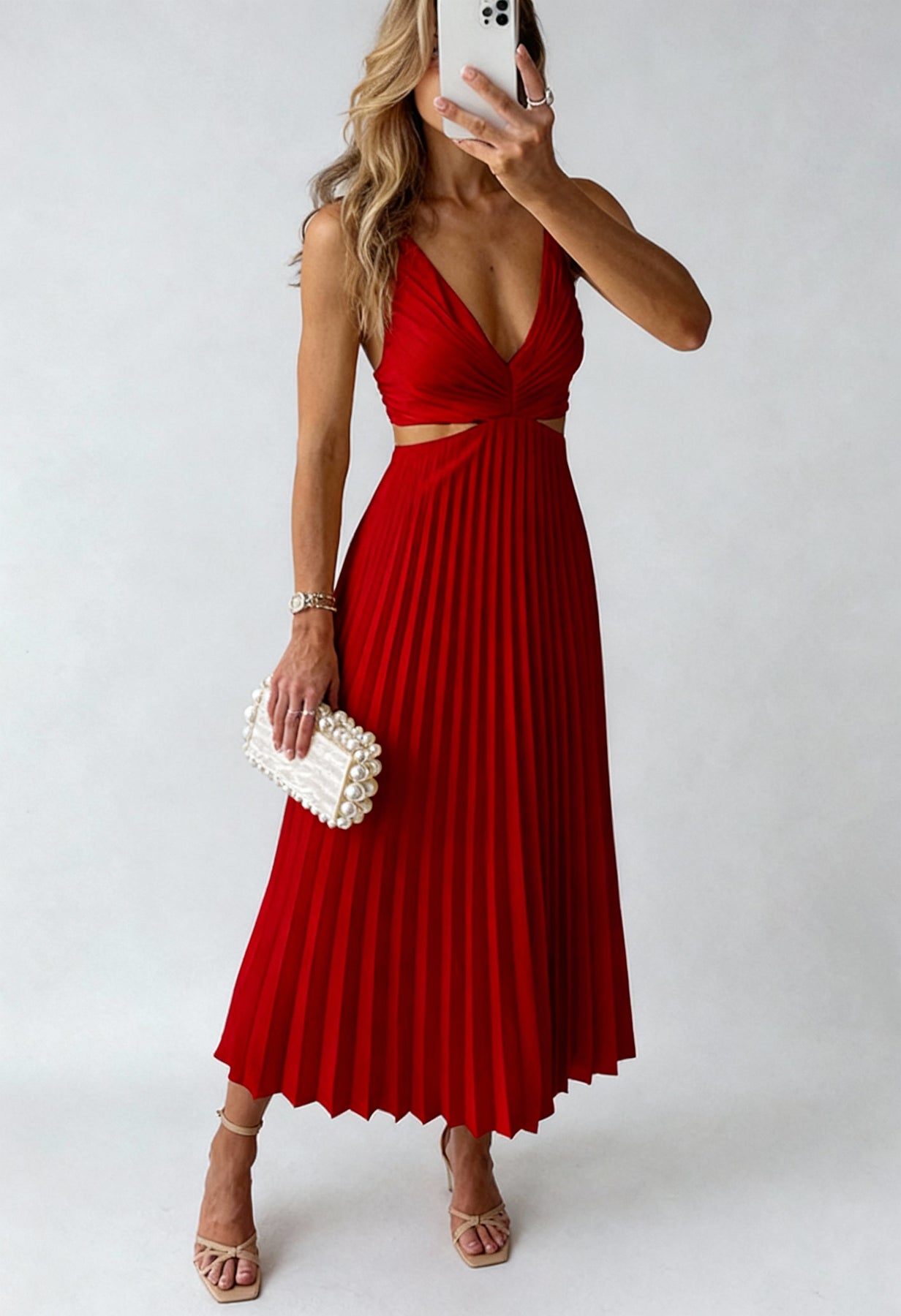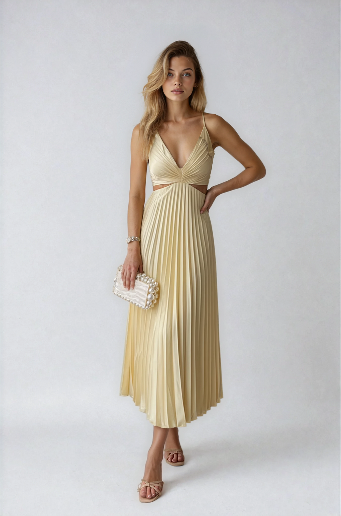 Ta sukienka midi zachwyca plisowanym dołem i dekoltem w kształcie litery V, który podkreśla sylwetkę. Wycięcie w talii dodaje nowoczesnego akcentu, tworząc harmonijny balans między elegancją a świeżością. Idealna na przyjęcia, kolacje lub wyjątkowe okazje, kiedy liczy się styl i pewność siebie.