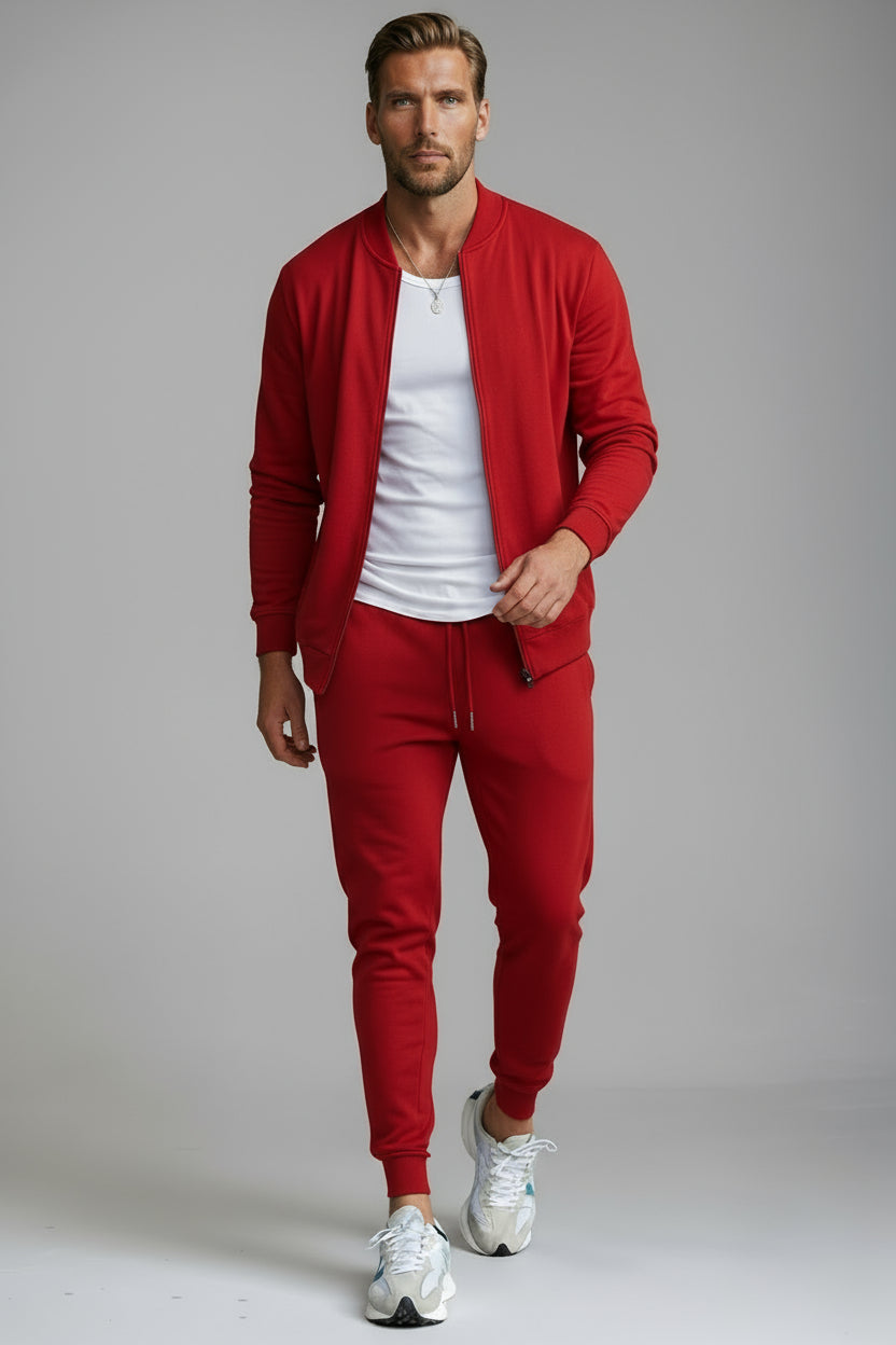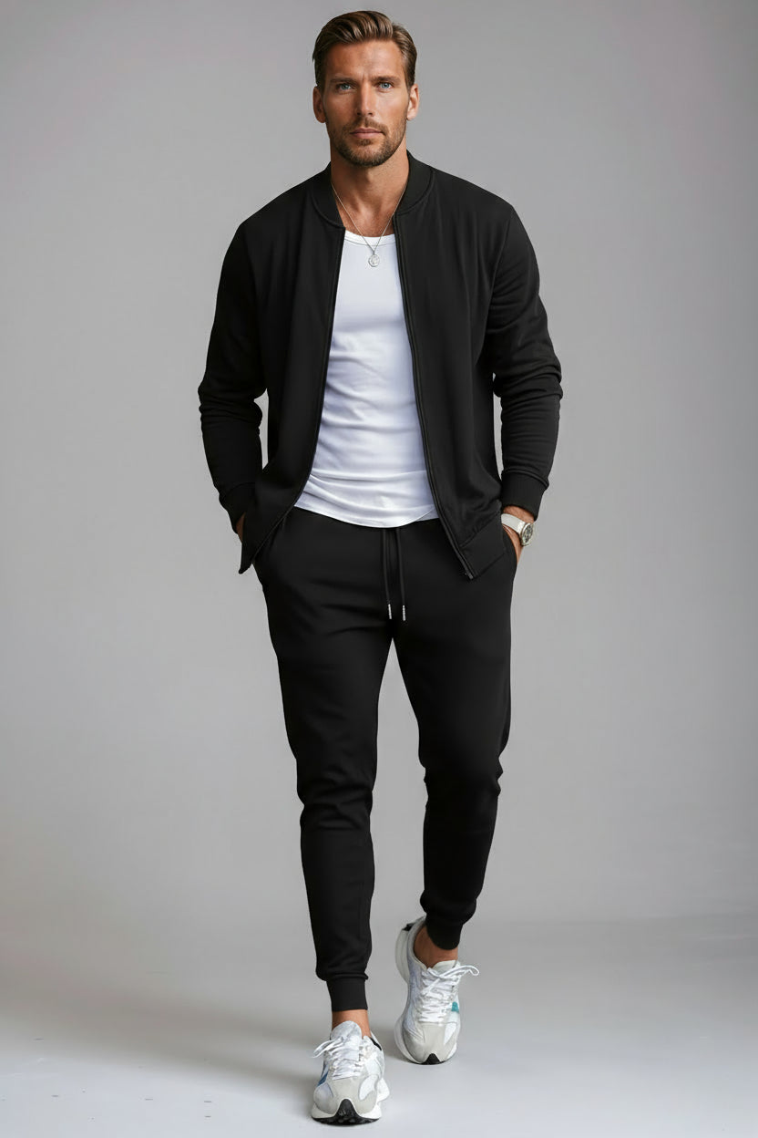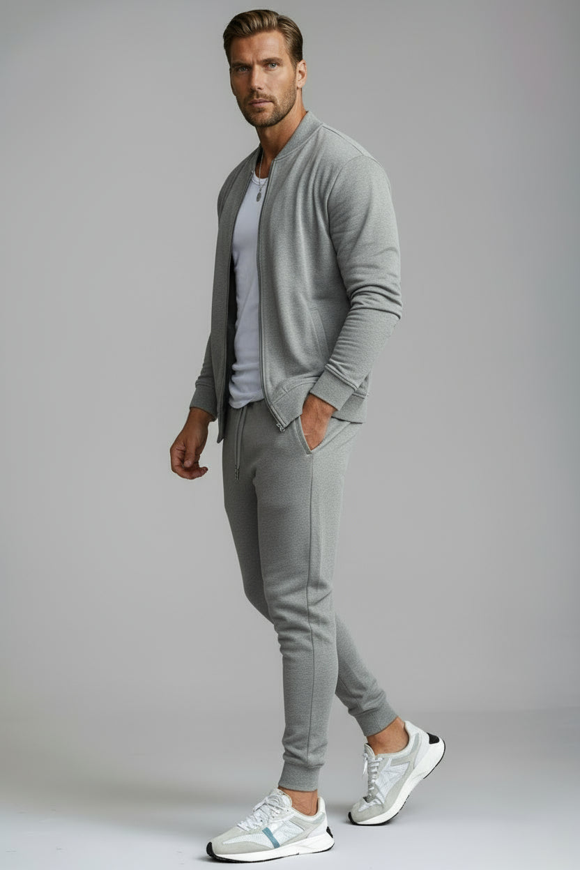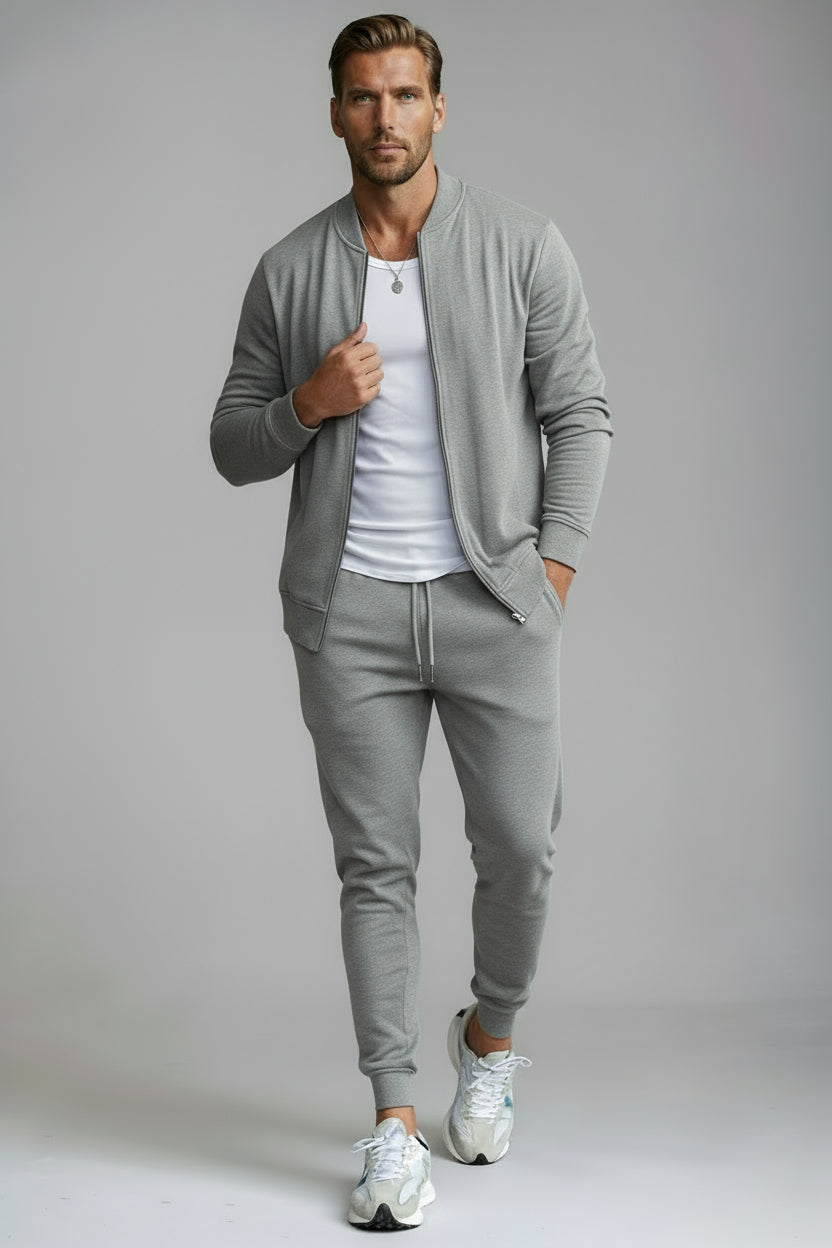 Ce survêtement pour homme a été conçu pour le confort et la mobilité, parfait pour les voyages, les tâches quotidiennes ou les week-ends décontractés. Le sweat zippé et le pantalon avec poignets élastiques garantissent une liberté de mouvement, tandis que la coupe simple et ajustée met en valeur la silhouette. Un ensemble idéal pour l’homme qui apprécie un style pratique et un look contemporain.